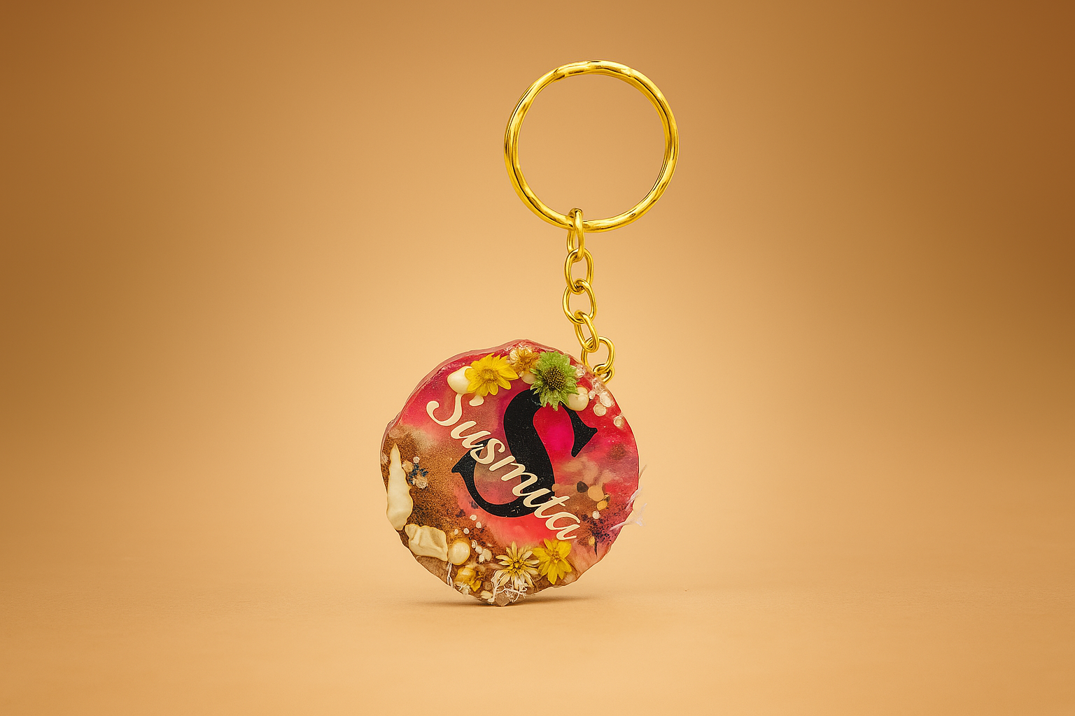 Available in a variety of vibrant colors, glitter finishes, and embedded designs — from dried flowers to metallic flakes — every keychain is one-of-a-kind. The smooth, glossy surface resists scratches and adds a premium feel, while the sturdy metal ring ensures your keys stay securely fastened.