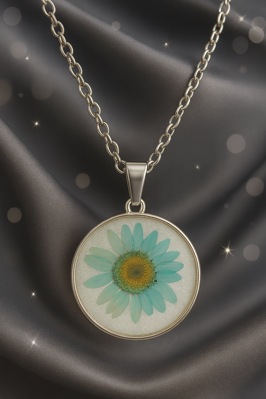 Our designs feature delicate dried flowers, gold leaf, metallic flakes, pigments, or ocean-inspired swirls, each suspended in clear resin like a tiny world of art. Every piece is unique — no two pendants are ever the same.